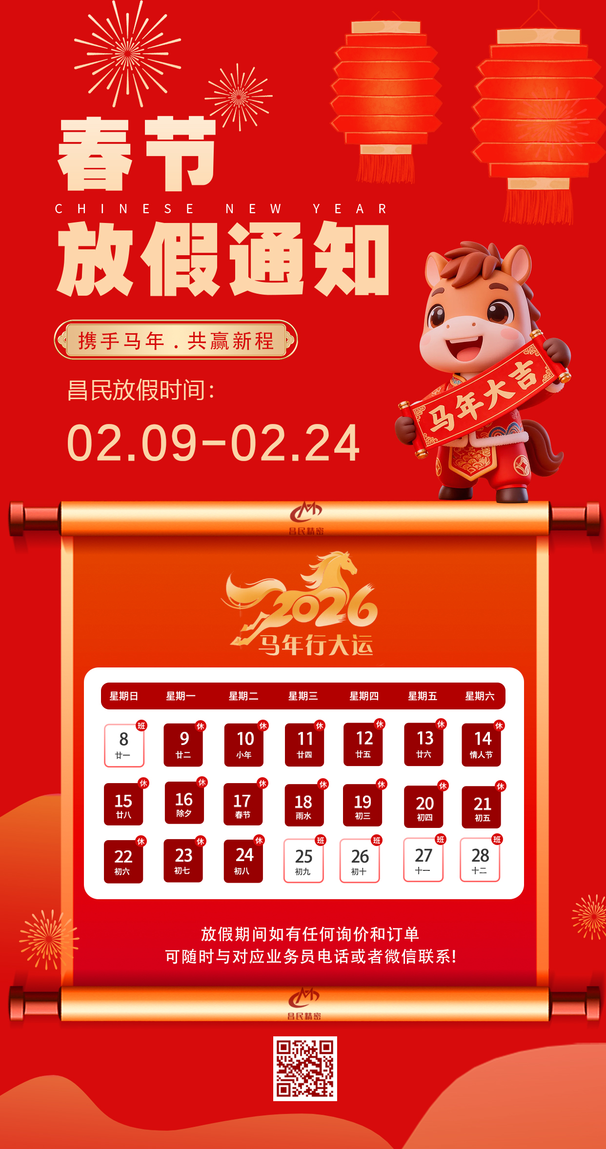 春节将至,为让全体员工共度祥和团圆的假期,并结合我司实际情况,现将2026年新春放假安排时间如下:2026年2月8日至2月24日,2月25日(正月初九)正式复工。新岁启新章,感谢您一直以来的理解与包容,华体会体育平台-华体会(中国) 全体祝您新春安康、顺遂无忧!新的一年,一起携手共进、共促发展!